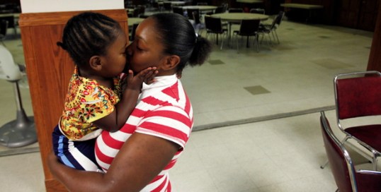 LaKia Ramsey, 26, (R) gets a kiss from her daughter Arian, 2, at the Covenant Presbyterian Church temporary shelter, which has opened it’s doors to house 30 homeless people for the week of the Democratic National Convention, in Charlotte, North Carolina September 5, 2012. According to Ramsey, she and her family were forced to leave the hotel room they were living in by hotel staff who wanted to charge a higher rate for convention goers. The hotel said Ramsey was asked to leave for reasons unrelated to the convention. REUTERS/Jessica Rinaldi (UNITED STATES – Tags: POLITICS RELIGION)