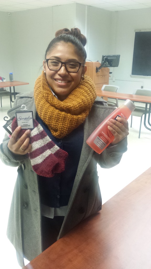 Ladey donates hair product and cozy socks form the UCONN people who care